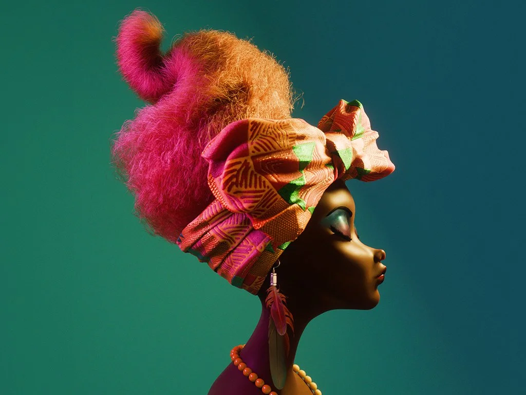 Rendered with sculptural precision and a strong sense of visual storytelling, the piece presents Amina with her head held high, eyes closed in quiet strength. Her features are stylized yet elegant, embodying confidence, dignity, and grace. The bold, voluminous hairstyle and vibrant headwrap infused with traditional West African patterns pay homage to her heritage while placing her firmly within a modern visual language.
