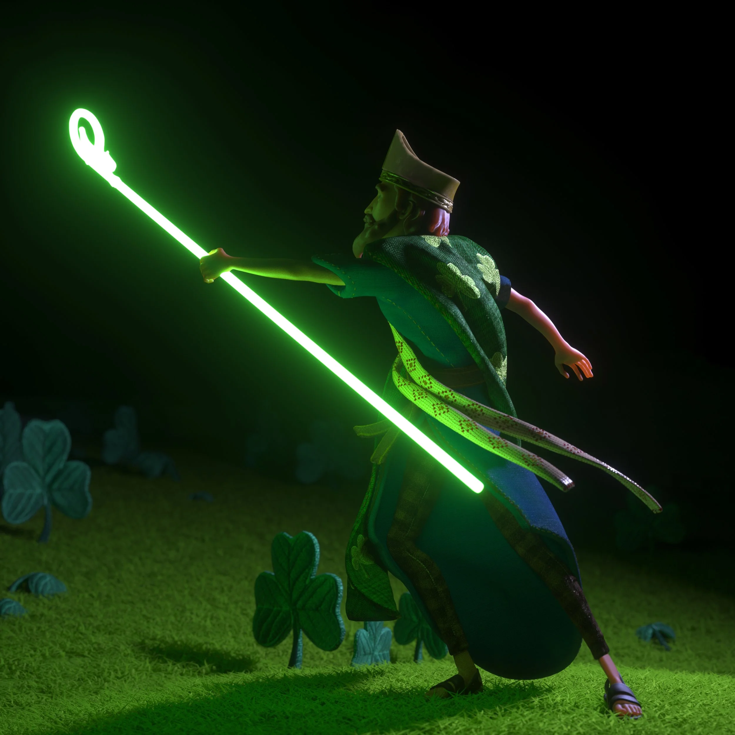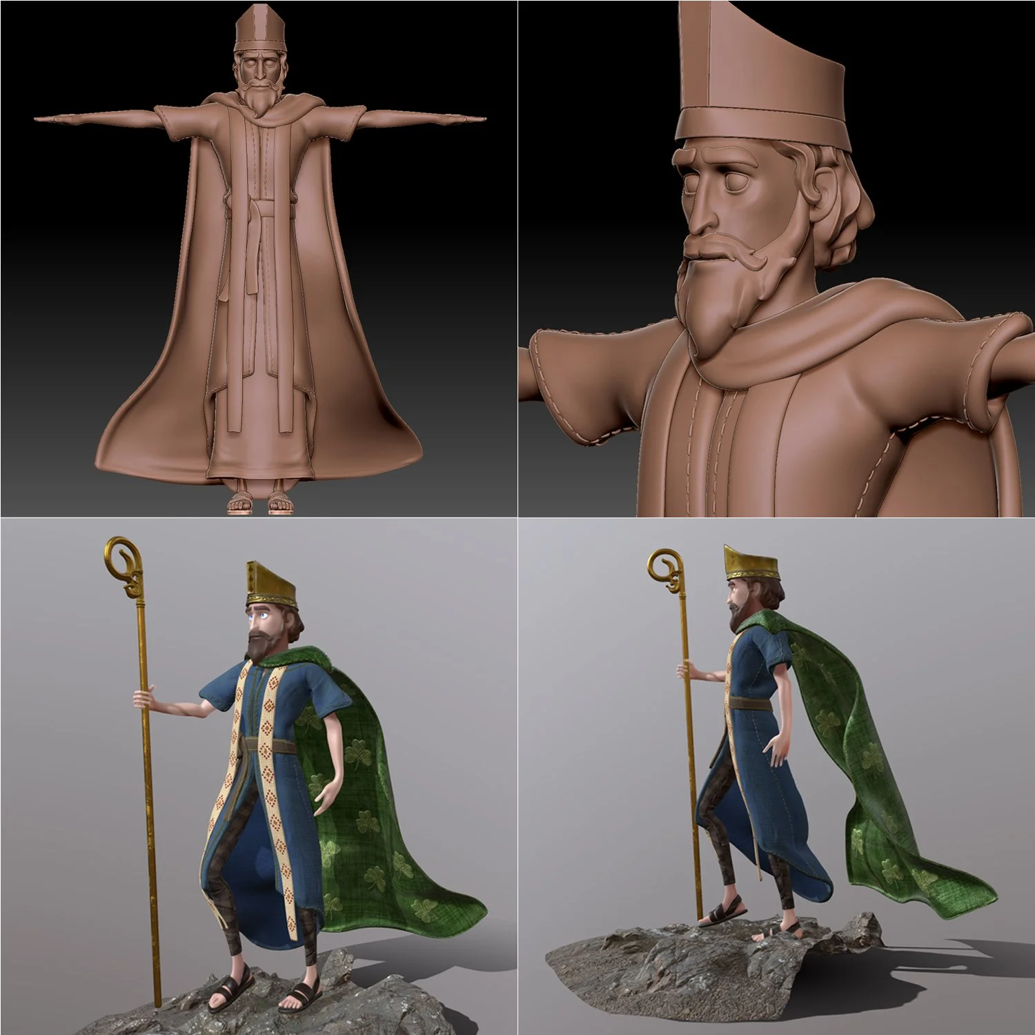 The project included sculpting, texturing, lookdev, and posing for promotional stills resulting in a faithful, kid-friendly 3D interpretation of Saint Patrick as both historical figure and folklore hero.