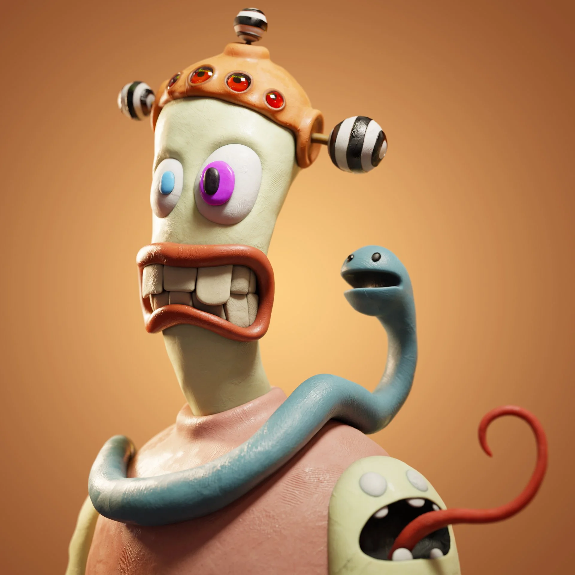 With exaggerated facial features, bulbous eyes, and a comically tense expression, the character captures the surreal charm and manic energy fans of The Neverhood know and love. Modeled to evoke the feel of sculpted clay and physical texture, the piece emphasizes expressive form, wonky proportions, and tangible surface detail. The snake-like creature coiled around the character and the bizarre mouth-on-shoulder add to the oddball surrealism.